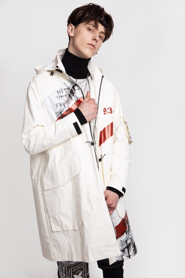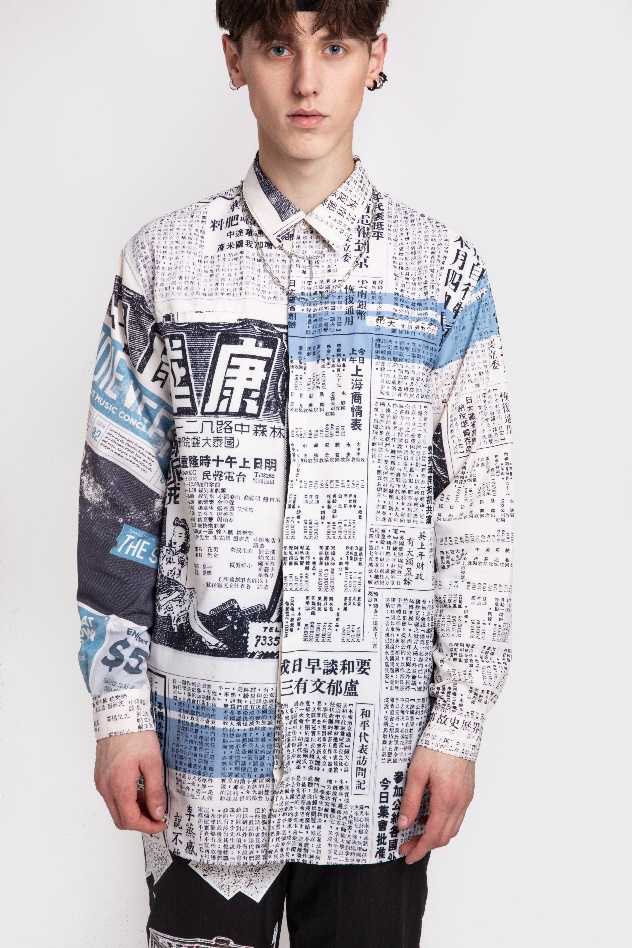 主題下分為三個(gè)系列,第一個(gè)系列是情報(bào)系列,也是特色系列。為此我專門去上圖查閱了新民晚報(bào)在建國后的期刊,搜集創(chuàng)作素材,結(jié)合over size的潮流設(shè)計(jì)了報(bào)紙素材拼貼襯衫,紙質(zhì)肌理的老上海街景燙畫輕質(zhì)風(fēng)衣等。第二個(gè)系列是霓虹系列,靈感來源于百樂門,南京路的夜景,因?yàn)橐股钍枪沤裆虾W罹叽硇缘姆?hào)之一,主要通過解構(gòu)主義印花的方式呈現(xiàn)。第三個(gè)系列是夜光系列,靈感來源于梅雨季節(jié)的路面星光,燈紅酒綠支離破碎的倒影,主要以各類熒光色條紋的重組作為圖案.