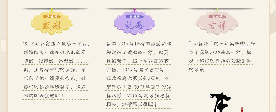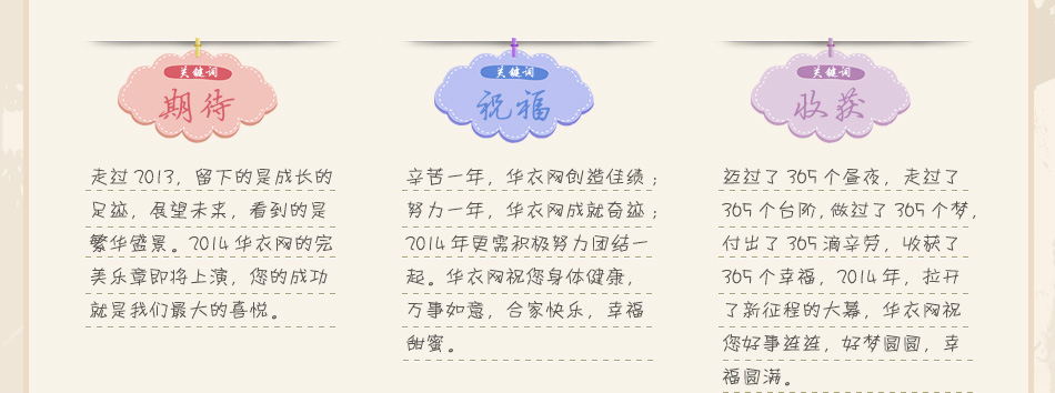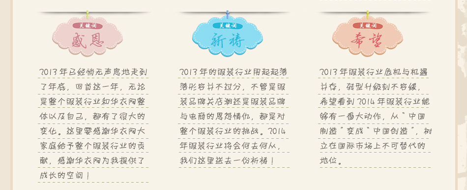| 服裝媒體是服裝行業(yè)中必不可少的組成部分,也是整個服裝行業(yè)必不可少的公眾力量。華衣網(wǎng)作為服裝行業(yè)第一網(wǎng)絡(luò)傳媒,在此為2014年服裝行業(yè)送上我們的祝福! |