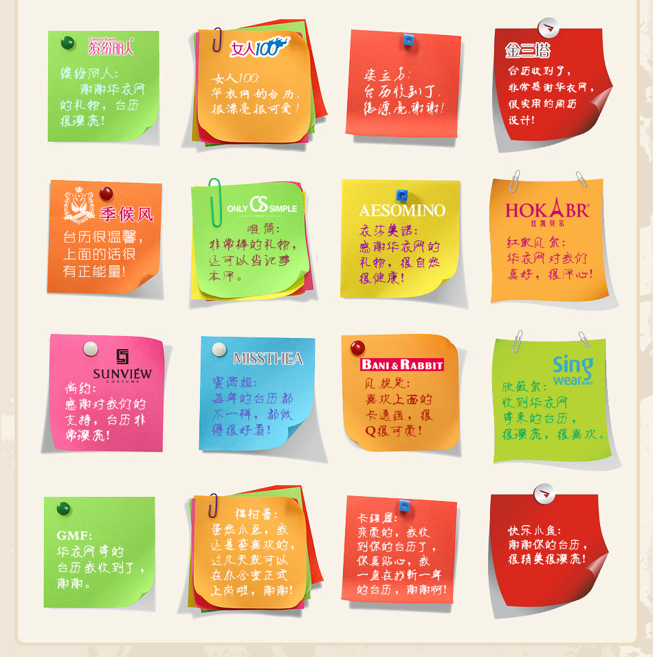 | 華衣網(wǎng)2014感悟正能量主題臺歷,不僅是華衣網(wǎng)回饋廣大服裝品牌的小小心意,同時也是華衣網(wǎng)為服裝行業(yè)傳遞正能量的重要媒介。您想知道各大服裝品牌在收到華衣網(wǎng)的臺歷后,都說了哪些話呢?一起來看看吧! |