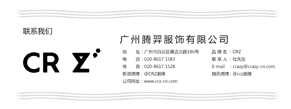作為潮銳服裝主流品牌,CRZ一直以打造國(guó)際一線潮牌為目標(biāo),并邀請(qǐng)日本知名潮銳設(shè)計(jì)師擔(dān)任設(shè)計(jì)顧問(wèn)。CRZ的服裝擁有夸張的廓形設(shè)計(jì),獨(dú)特的裁剪處理、個(gè)性的色彩搭配和舒適的柔軟面料,通過(guò)服裝設(shè)計(jì)表達(dá)出現(xiàn)代年輕人在樂(lè)活的世界里玩出自我格調(diào)、制造話題、永遠(yuǎn)對(duì)主流常識(shí)保持質(zhì)疑和追求自己的答案的潮態(tài)度。