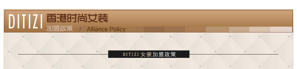 | 香港著名女裝DITIZI迪緹孜,原名D.T.Z,品牌傳承了歐式設(shè)計的精髓,是真正的高端、大氣、上檔次,DITIZI迪緹孜女裝追求的是簡約的設(shè)計,卻盡顯奢華,服裝專注每一個細(xì)節(jié),品質(zhì)高端,細(xì)節(jié)完美,提升每一位都市女性的穿衣品位。如果你追求完美的穿著和高端的品位,DITIZI迪緹孜女裝一定是你的首選,每一件產(chǎn)品都是精品,每一款設(shè)計都是精髓。忙碌在職場的白領(lǐng)女性、都市麗人,對于這樣的服裝一定是愛不釋手吧! |