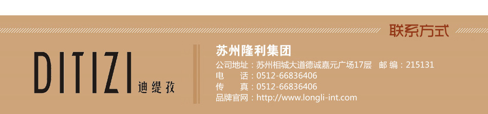 | DITIZI迪緹孜——香港著名時裝品牌,誕生于隆利國際發(fā)展有限公司,總部設(shè)于香港,主要從事設(shè)計研發(fā)女裝產(chǎn)品。行銷內(nèi)地、香港等多個國內(nèi)外地區(qū),并迅速在各大城市獲得贊譽(yù)。公司聘請香港設(shè)計師參與設(shè)計,通過自主創(chuàng)新融合國外及國內(nèi)女裝設(shè)計精華,將品牌時裝定位于28-45歲有內(nèi)涵和品味的魅力女性。她們崇尚生活,追求品質(zhì),獨立自主,有審美情趣且知性。DITIZI迪緹孜時裝運用高級加工技藝和精致高檔的面輔料,對時裝進(jìn)行完美的詮釋,強(qiáng)調(diào)服裝的功能與舒適性。 “DITIZI迪緹孜女裝”自創(chuàng)立以來一直追求高質(zhì)量標(biāo)準(zhǔn),致力于打造一個高品質(zhì)的時尚女裝品牌,純正歐式裁剪,承襲經(jīng)典傳奇,緊貼巴黎、倫敦、米蘭、紐約、香港最新潮流指標(biāo)發(fā)布。設(shè)計師游走在每個繁華與喧囂的街頭,攫取任何一個動人的瞬間,記錄下靈感來源。這是一個激情與夢想的年代,讓時尚設(shè)計真正的走到每個人身邊,是DITIZI迪緹孜專屬設(shè)計師最大的夢想。 DITIZI迪緹孜女裝視品質(zhì)為生命,從設(shè)計到生產(chǎn),層層把關(guān),注重細(xì)節(jié),通過全球精心挑選高級面料,以進(jìn)口面料,天然面料為主,精湛做工流利裁剪反映在每一個內(nèi)外細(xì)節(jié),極力締造完美非凡品質(zhì)工藝,超越尊貴顧客不斷升級的品質(zhì)期待。每款限量生產(chǎn)與銷售,讓愛美獨特的女士不撞衫,不從眾。 |