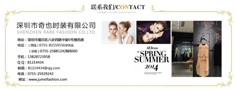 | 深圳市奇也時(shí)裝有限公司,創(chuàng)立于2005年,是集服裝設(shè)計(jì)、生產(chǎn)制造與銷(xiāo)售 服務(wù)為一體的專(zhuān)業(yè)化時(shí)裝品牌運(yùn)營(yíng)公司。 自創(chuàng)立之初,奇也便秉承“實(shí)現(xiàn)優(yōu)雅的生活”的理念,致力將外在的服飾語(yǔ) 言:優(yōu)雅,自信,獨(dú)立,感性。 “JUMEL(芮瑪)”是奇也旗下穩(wěn)步成長(zhǎng)的中高端女裝品牌。“JUMEL(芮瑪) ”設(shè)計(jì)團(tuán)隊(duì)由留法資深設(shè)計(jì)師主持,追求將創(chuàng)意和經(jīng)典、設(shè)計(jì)與實(shí)用并用,重視 品質(zhì),而產(chǎn)品又不失年輕化,堅(jiān)持創(chuàng)建一種適合東方女性的內(nèi)斂、優(yōu)雅風(fēng)格。 “JUMEL(芮瑪)”相信,始終如一的持恒初衷,可以在現(xiàn)代都市女性的生活中實(shí) 現(xiàn)她們永恒優(yōu)雅的夢(mèng)想。 在JUMEL(芮瑪)品牌背后,奇也時(shí)裝團(tuán)隊(duì)同樣堅(jiān)持奉行低調(diào)而單純的夢(mèng)想。 這個(gè)穩(wěn)定而高效的專(zhuān)業(yè)團(tuán)隊(duì)以同樣的氣質(zhì),精心培育著JUMEL(芮瑪)品牌的健康 成長(zhǎng),并相信“始終如一,沿著正確的方向做好每個(gè)細(xì)節(jié),結(jié)果自然會(huì)好”。以 平靜而從容的心態(tài)懷想,生活是公平的,夢(mèng)想就在不遠(yuǎn)處。八年來(lái),JUMEL(芮瑪) 品牌從不傲慢地炫耀,也不淺薄的放任,每一步都是踏實(shí)地向夢(mèng)想前進(jìn)。這不僅僅 是JUMEL(芮瑪)的設(shè)計(jì)哲學(xué),更是奇也團(tuán)隊(duì)的真實(shí)性格。 穩(wěn)定,專(zhuān)業(yè)高效的團(tuán)隊(duì)是奇也時(shí)裝與“JUMEL(芮瑪)”品牌可持續(xù)發(fā)展的基石。在當(dāng)代日益浮躁的商業(yè)化杜會(huì)中,我們希望通過(guò)高效的工作創(chuàng)建一家受人尊重的公司,使公司的每一位員工在行業(yè)內(nèi)、在社會(huì)中成為一個(gè)受人尊重的人。 奇也人認(rèn)為,對(duì)這個(gè)杜會(huì)而言,單純、真誠(chéng)與責(zé)任也是一種力,―可以實(shí)現(xiàn)夢(mèng)想的力里! |