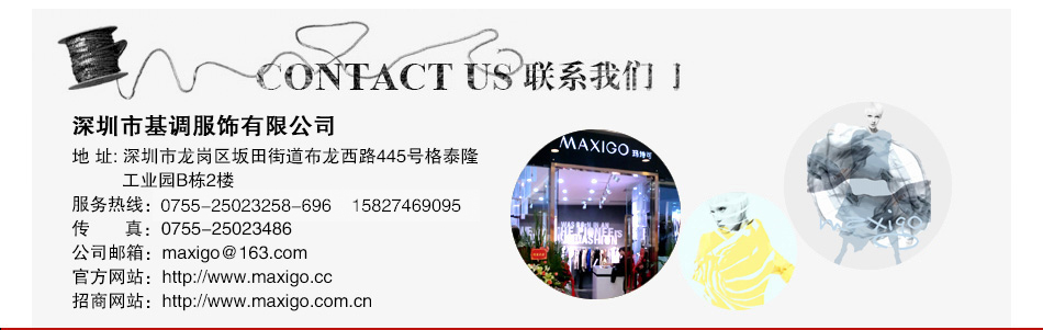 | 瑪詩可女裝擁有遍布于全國各地的買手、富有創(chuàng)新和豐富經(jīng)驗(yàn)的設(shè)計(jì)師團(tuán)隊(duì)以及國外一線時(shí)尚品牌設(shè)計(jì)師團(tuán)隊(duì)結(jié)合;無論從產(chǎn)品研發(fā)、新款上市速度均領(lǐng)先于同行,被業(yè)界譽(yù)為“流行時(shí)尚的快速復(fù)制者”。 超過40家以上加工生產(chǎn)戰(zhàn)略合作伙伴,產(chǎn)品質(zhì)量和上貨速度擁有強(qiáng)大保證。 瑪詩可女裝提供確實(shí)可行的盈利合作模式,針對(duì)不同區(qū)域市場(chǎng)狀況及市場(chǎng)變化,制定各種不同的個(gè)性化營銷方案及貼近市場(chǎng)的政策扶持,被加盟商稱之為是“一個(gè)可以貼近市場(chǎng)先利他再利己的公司”。 瑪詩可女裝擁有在同行中處于領(lǐng)先實(shí)力的培訓(xùn)團(tuán)隊(duì),為終端店鋪銷售提供充分而有全面的市場(chǎng)銷售分析與指導(dǎo),讓您贏在終端,贏在起跑線上。 MAXIGO瑪詩可女裝正在打造的服裝商學(xué)院,將為您提供學(xué)習(xí)和提升的機(jī)會(huì),致力于把您變成教導(dǎo)型企業(yè)家,未來還將為您源源不斷地培養(yǎng)和輸送服裝各崗位優(yōu)秀人才。 |