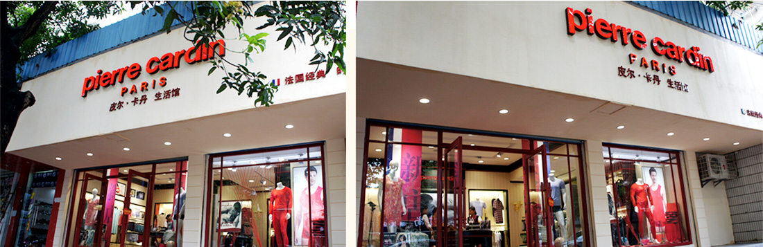 皮爾·卡丹(Pierre Cardin)生活館的門頭,即使是文字亮光部分的邊緣中也呈現(xiàn)著一種紅色的貴氣,